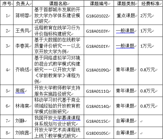 近日,国家开放大学印发《关于国家开放大学分部2018年度科研课题立项的通知》,我校有8项课题获批立项,其中重点课题1项、一般课题2项、青年课题3项、自筹课题2项,特向8位课题负责人及课题组表示祝贺。国家开放大学科研课题每两年申报1次,我校本次获批课题较2016年上涨了60%。
