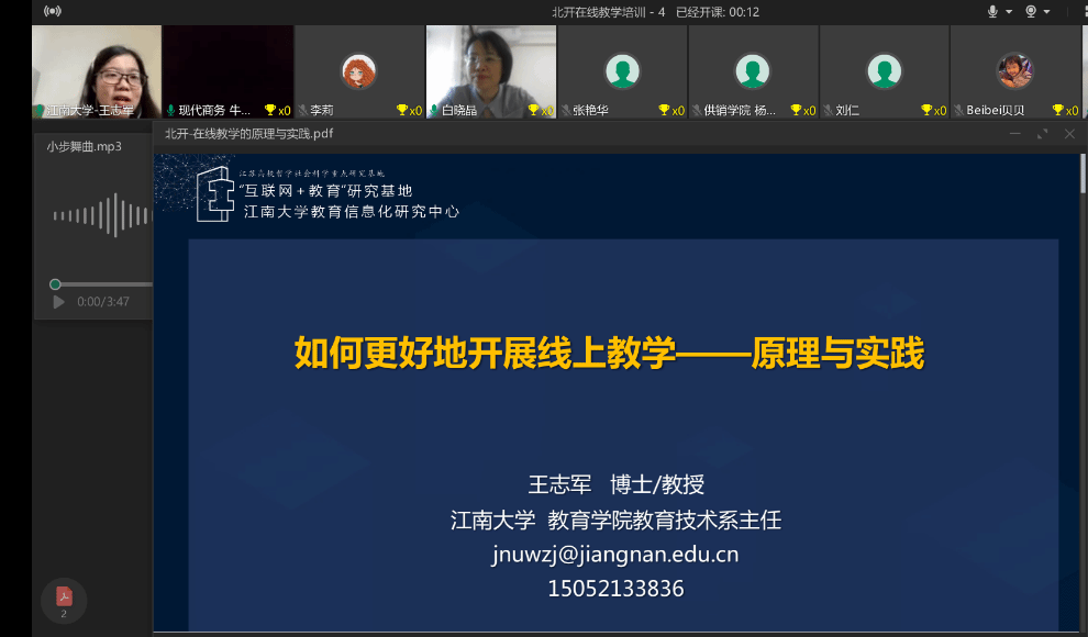江南大学王志军教授进行了主题为“如何更好地开展线上教学—原理与实践案例”的培训。在培训中,她结合在线教学经验、在线教学基本原理以及在线教学实际案例,让大家体会到加强在线教学交互设计的重要性,以及教师需要增强教学设计能力服务学生学习成效的能力要求。