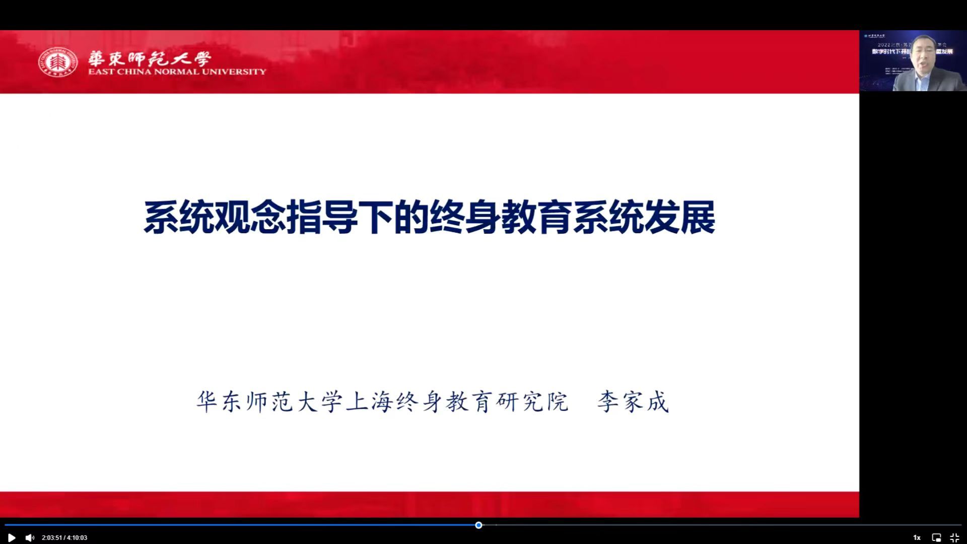 上海终身教育研究院执行副院长、华东师范大学教授李家成做了题为“系统观念指导下的终身教育系统发展”报告。他指出,党的二十大报告提出“必须坚持系统观念”,终身教育应以系统观念为指导,幼儿园、中小学、大学、职业院校与成人教育机构要有机联系、多维互动、互联互通,做到“系统集成、协同高效”,更好地满足学习者灵活性、个性化学习需要,实现共学互学。