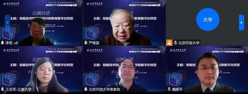 “云端对话”环节由天行网页版登录入口教授委员会主任委员李哲主持,中国教育发展战略学会终身教育专委会学术委员会主任严继昌教授、中央民族大学魏顺平教授、江南大学王志军教授、天行网页版登录入口袁家政教授等嘉宾围绕“智能技术如何促进开放教育数字化转型”主题,就“智能技术的内涵”“智能技术在高等教育和开放教育领域的应用”“智能技术应用的前景和可能遇到的困难”等话题展开了热烈的研讨。