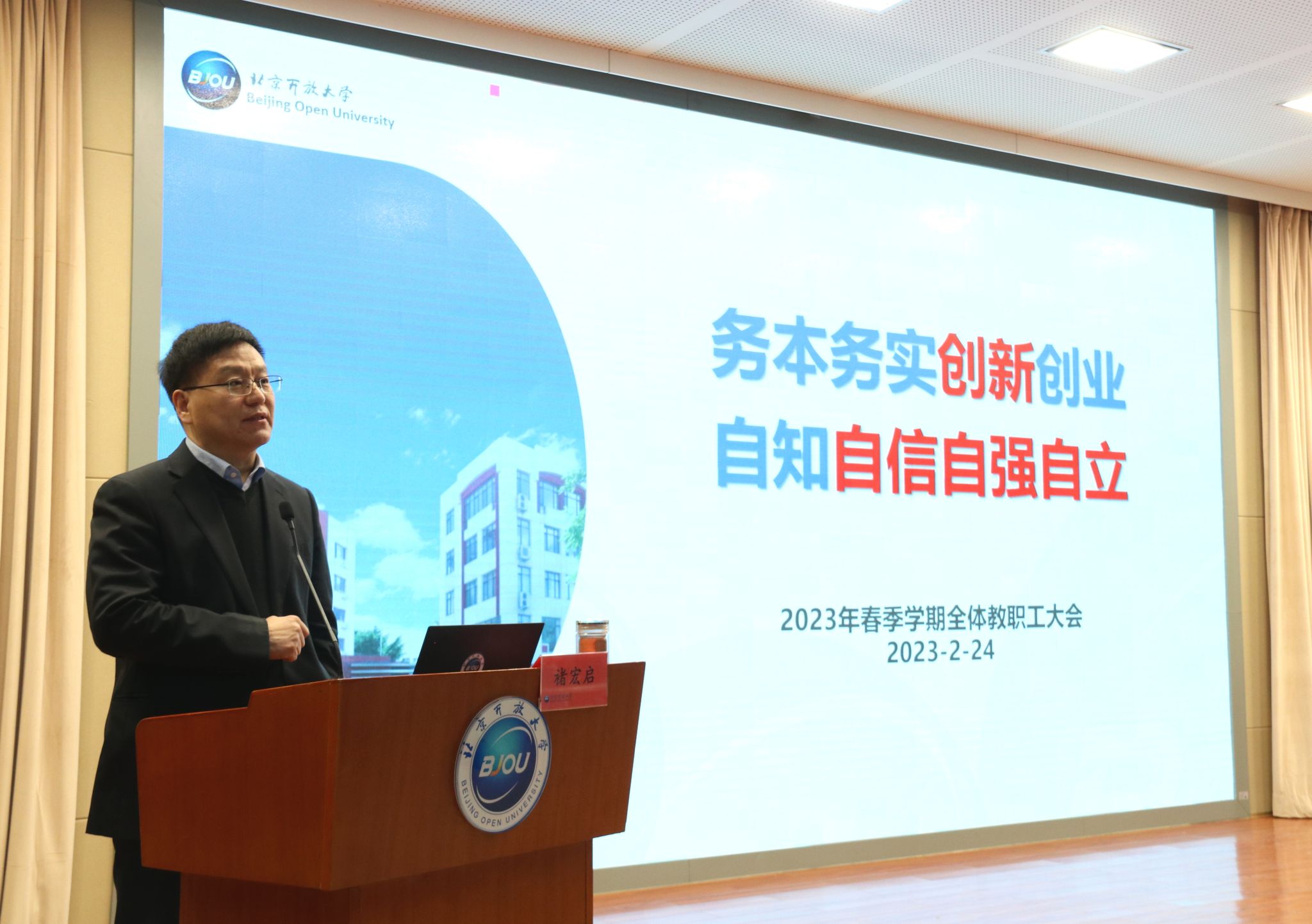2月24日上午,学校召开2023年春季学期全体教职工大会,部署2023年工作。本次会议主题是坚持以习近平新时代中国特色社会主义思想为指导,深入学习贯彻党的二十大精神,把握形势、明确任务,围绕新时代新征程,创新发展、凝心聚力,推动学校全年各项任务圆满完成。党委副书记、校长褚宏启主持会议并以“务本务实创新创业,自知自信自强自立”为主题做了讲话。