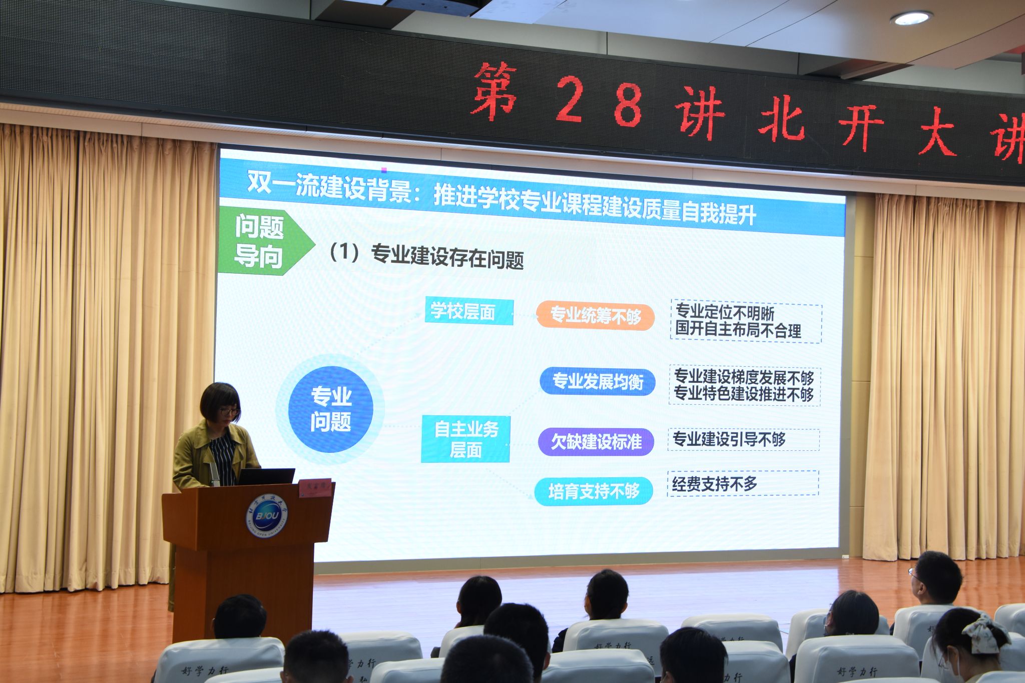 教务处副处长周晖做了题为“《关于推进一流专业和一流课程建设的实施意见》解读”的专题发言,她结合“双一流”建设背景下如何推进学校专业课程建设质量自我提升,介绍了文件撰写的总体思路,详细解读了实施意见的专业建设、课程建设、教学改革等八大项内容要点。