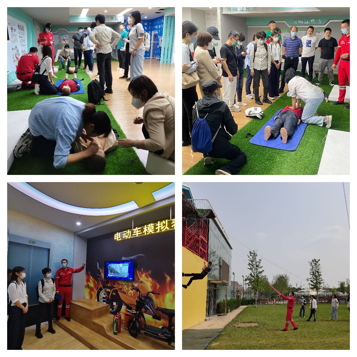基地工作人员详细介绍了应急安全教育基地基本情况,并为教职工播放了应急安全科普视频,工作人员还认真细致地为参加活动的教职工讲解了地震求生、毒品危害、食品安全、用电安全、消防安全等方面的安全知识。在互动体验环节,教职工体验了模拟防踩踏训练、模拟火场逃生、模拟场景灭火、心肺复苏急救等项目。