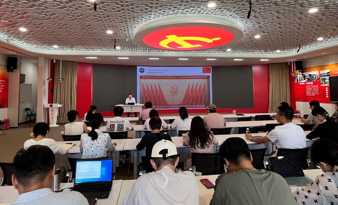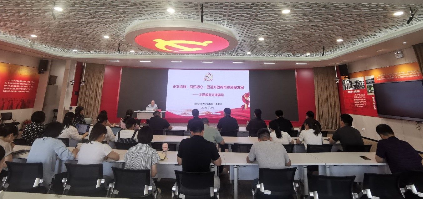 6月27日,副校长李继延以“正本清源、回归初心,促进开放教育高质量发展”为题,为教务处、人文与教育学院、商学院、城市管理学院、科学技术学院、事业发展部、国开业务部等部门和学院的党员干部讲主题教育专题党课。党课围绕主题教育“学思想、强党性、重实践、建新功”总要求,对深入学习贯彻习近平新时代中国特色社会主义思想、扎实推动教育强国建设进行了生动阐释,立足学历教育办学实际,从当前教育面临的大形势、我校的“正本清源之战”、当前开放教育面临的挑战、今后学历教育发展重点工作等四个方面进行了讲解,提出注重人才培养质量、突出开放教育“六随”办学特色、加强学历教育资源整合优化、加强办学风险防控、加强两级办学体系建设、构建终身学习体系等六个方面工作要求。引导党员干部始终坚持高质量发展的理念和“以学生为中心”的教育情怀,用实际行动助推学校高质量发展。