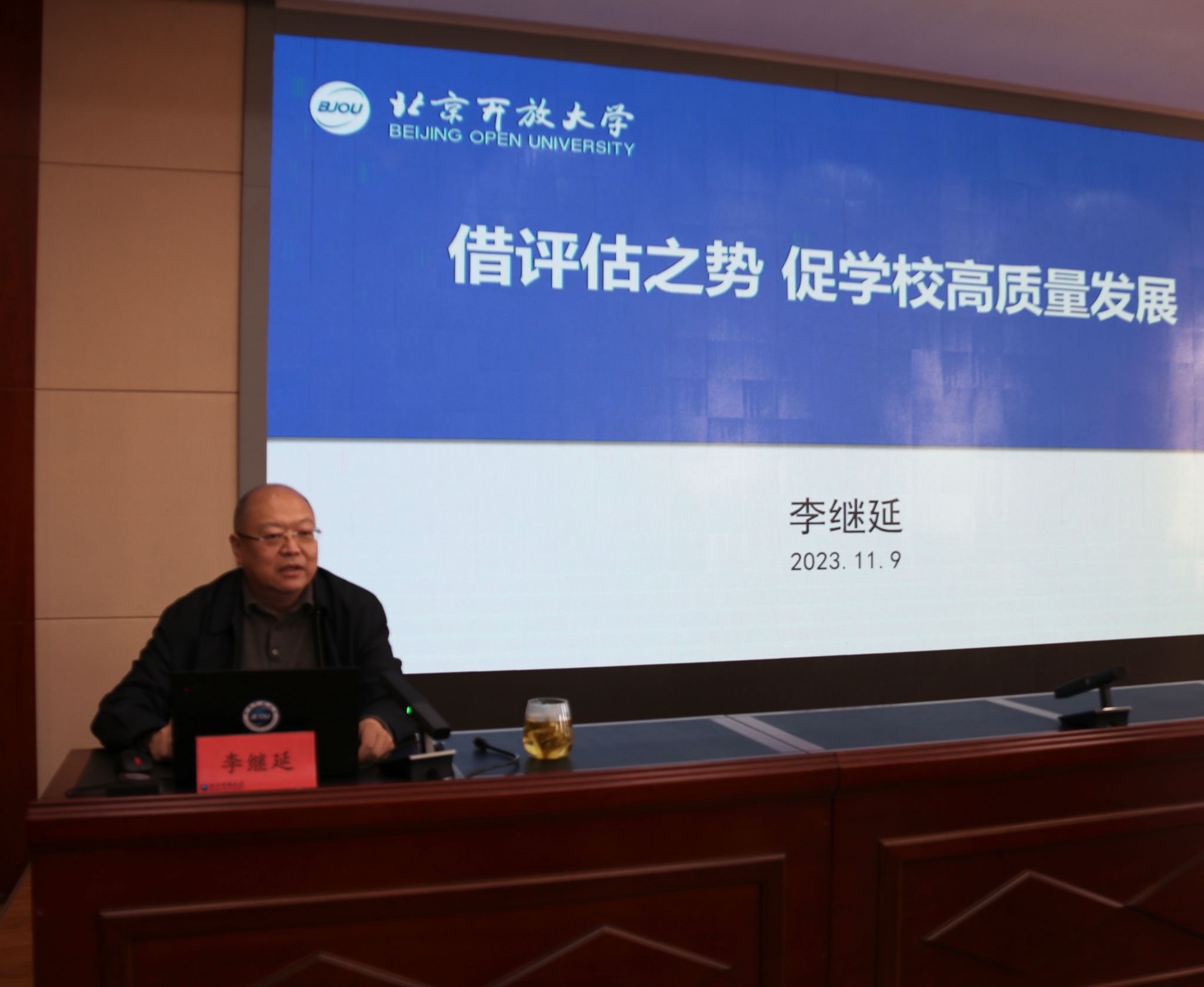 李继延副校长以“借评估之势,促学校高质量发展”为题,对我校从接到国家开放大学办学评估通知开始至今所开展的评估工作进行回顾总结。他指出,我校积极响应总部评估工作,2022年3月,由学校党委组成迎评领导小组,设立迎评工作办公室,正式启动迎评工作,在全校范围内召开系列工作推进会,扎扎实实地开展了32家学习中心办学评估。2023年7月出台《国家开放大学北京分部办学评估迎检工作方案》,确定了入校迎检工作的组织分工、主要任务及进度安排,对各部门及工作组提出了具体要求,将迎评工作小组分为文字材料组、支撑材料组、校园文化和校园环境建设组、宣传报道组、数字化展示建设组共五个小组,分别由校领导牵头,确保各项工作切实落实,迎评工作进入攻坚克难阶段。李继延副校长最后强调了当前迎评工作存在的几点问题和后续的工作重点与要点。