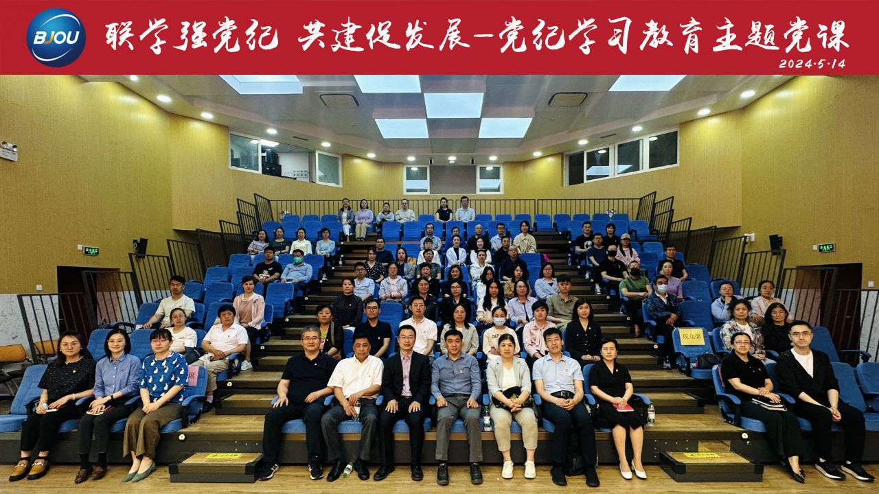 为进一步强化党员干部纪律意识,5月14日,我校老年教育学院党支部、纪检监察办公室党支部,联合国家开放大学老年学院党支部、北京青少年服务中心党建办公室党支部、西城区文化和旅游局机关党委、西城区图书馆党支部、新街口街道两新组织党委共90余名党员,在我校共同开展“联学强党纪 共建促发展”党建联学活动。学校党委委员、纪委书记周启柏作党纪学习教育专题党课辅导,国家开放大学老年学院党支部书记温书宇、我校纪检监察办公室党支部书记史颖、北京青少年服务中心党建办公室(纪检办公室)党支部书记段晓雁、西城区文化和旅游局一级调研员王顺、新街口街道两新组织党委书记刘鹏出席,活动由老年教育学院党支部书记殷丙山主持。