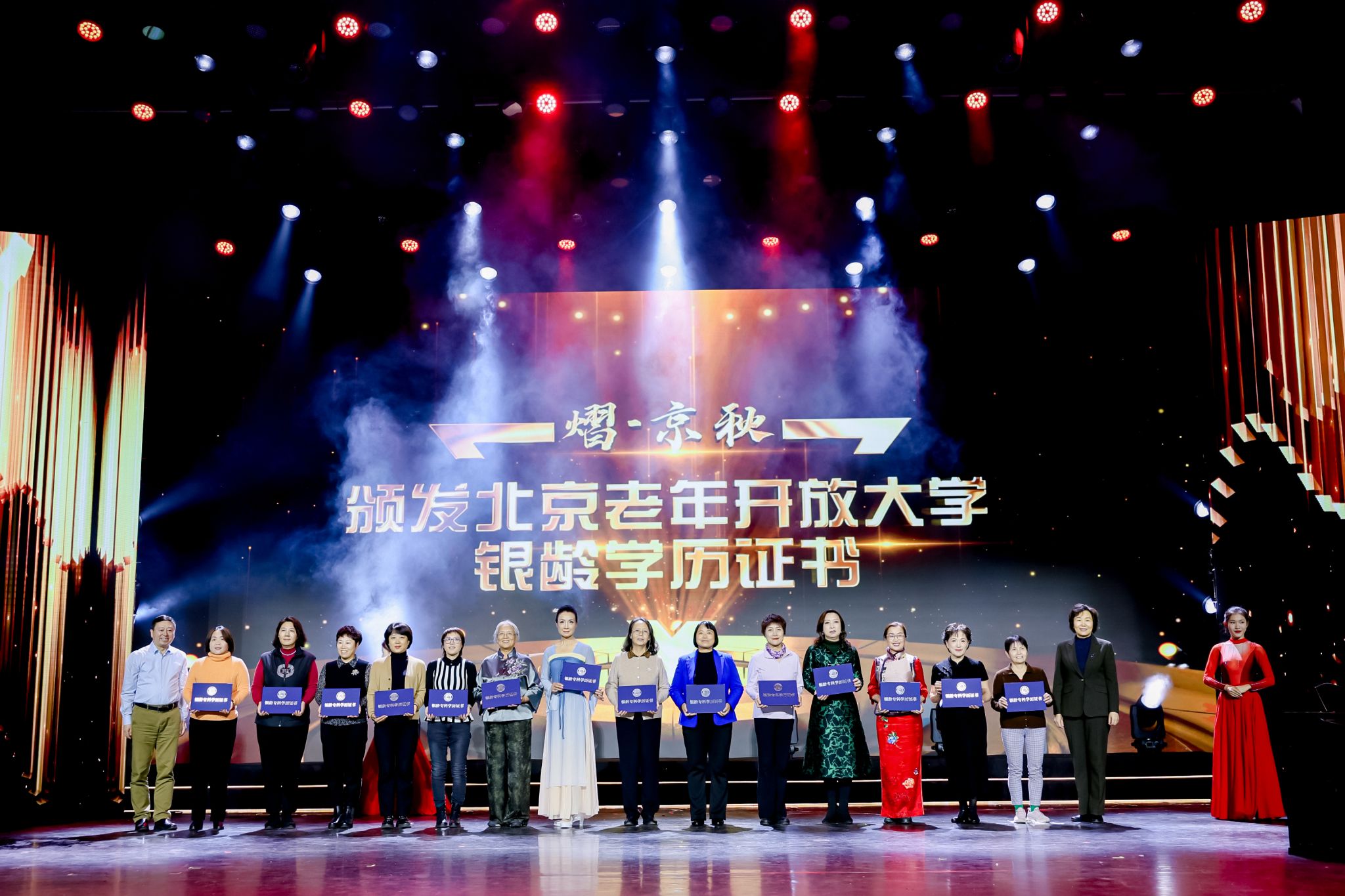 活动现场为“熠·京秋”第三届北京老年教育文化艺术节的获奖作品和获奖单位颁奖。本届艺术节经多轮评审、层层角逐,共产生了特等奖3份,一等奖49份,二等奖84份,三等奖163份,最佳人气奖151份,宣传组织奖41份。活动现场还为北京老年开放大学银龄学历的获得者颁发了学历证书。