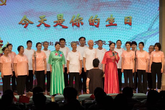 离退休党总支不忘初心,“退而不休心向党”,他们胸带党徽,激情澎湃的带来合唱《今天是你的生日》。