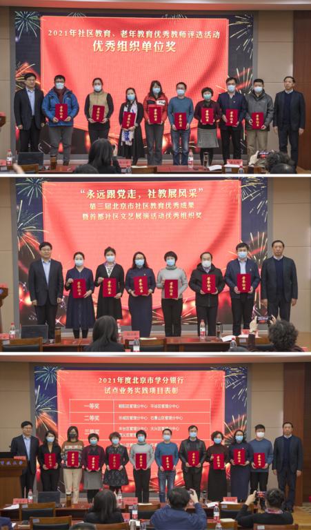 会上,还对“永远跟党走、社交展风采”第三届北京市社区教育优秀成果暨首都社区文艺展演活动、2021年社区教育和老年教育优秀教师评选活动优秀组织单位,以及2021年度北京市学分银行试点业务实践项目进行了表彰。