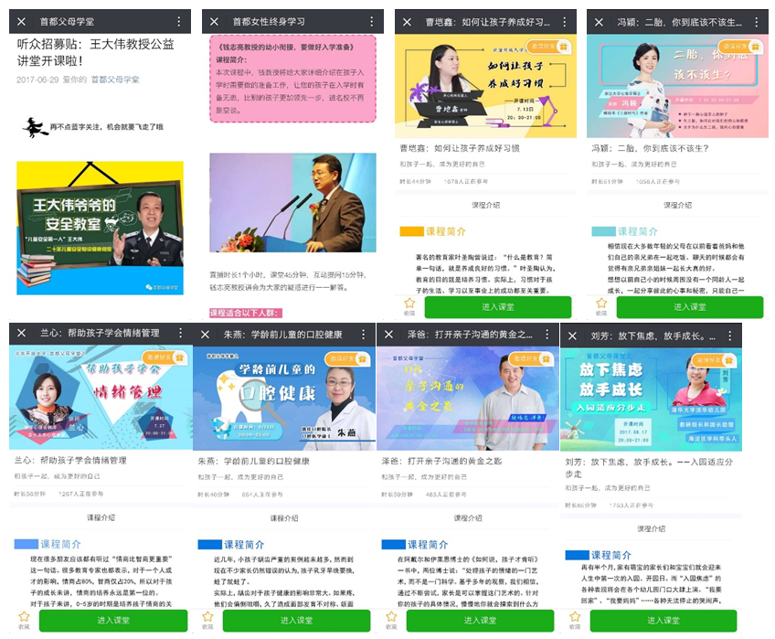 截至目前,开播的课程包括:中国人民公安大学“儿童安全第一人”王大伟教授的《儿童安全》、北京师范大学儿童教育专家钱志亮教授的《幼小衔接》、清华洁华幼儿园园长助理刘芳的《放下焦虑、放下成长、入园适应分步走》,以及著名教育机构创始人的系列分享,如:曹凯鑫的《如何让孩子养成好习惯》、冯颖的《二胎:你到底该不该生》,兰心的《帮助孩子学会情绪管理》、朱燕的《学龄前儿童的口腔健康》、泽爸的《打开亲子沟通的黄金之匙》,受到广泛关注,受众达49679人次。